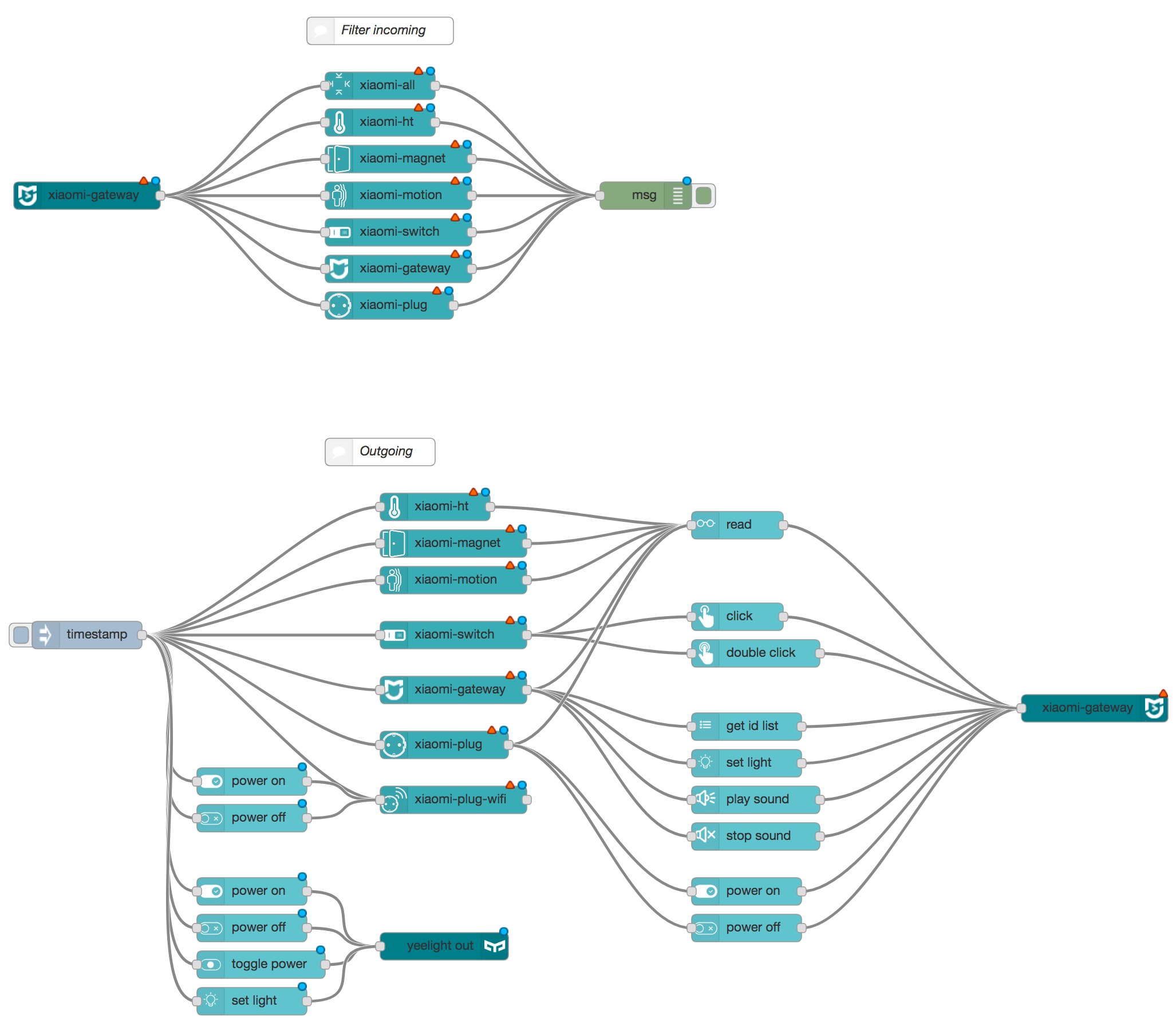 This module contains the following nodes to provide easy integration of the Xiaomi devices into node-red. This module is a fork of Harald Rietman module, node-red-contrib-xiaomi-devices